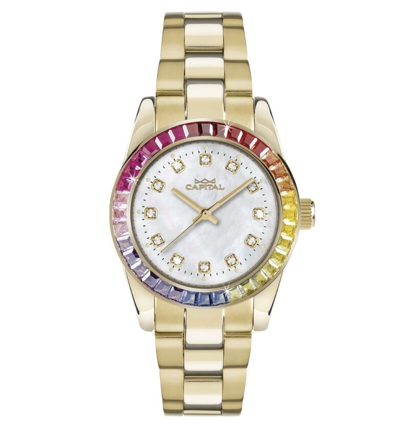 Cassa in acciaio placcata oro rotonda con ghiera con pietre incastonate 32 mm